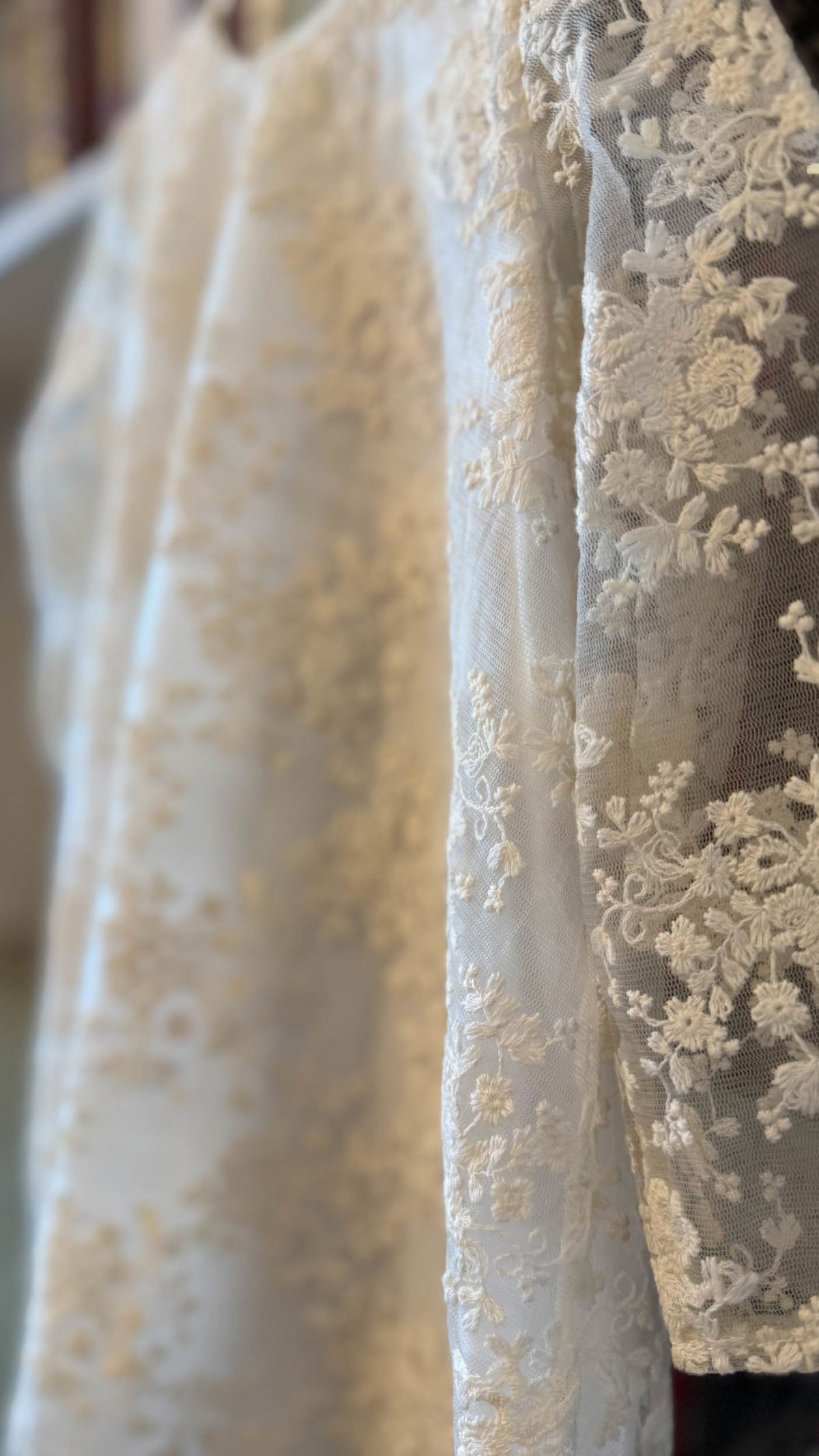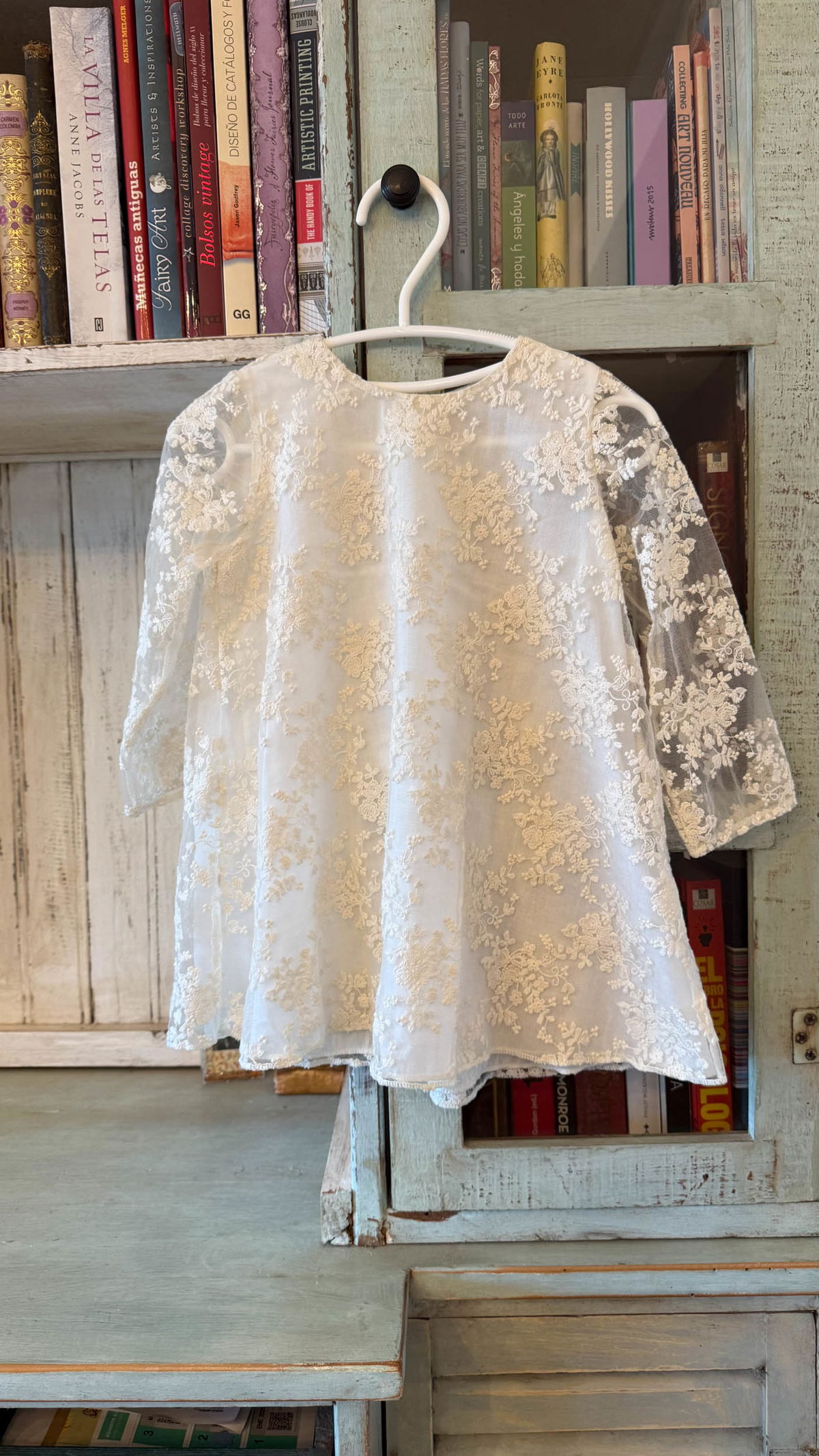 Este vestido es una pieza encantadora y sofisticada, con un diseño que combina la delicadeza del encaje con una forma cómoda y elegante.