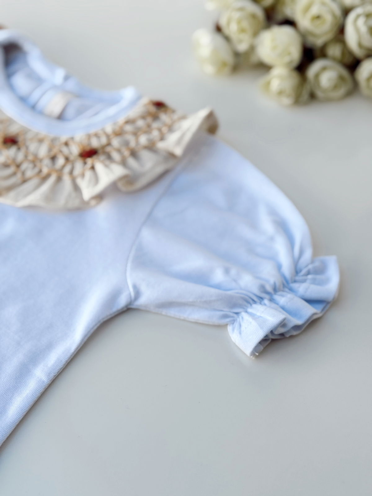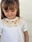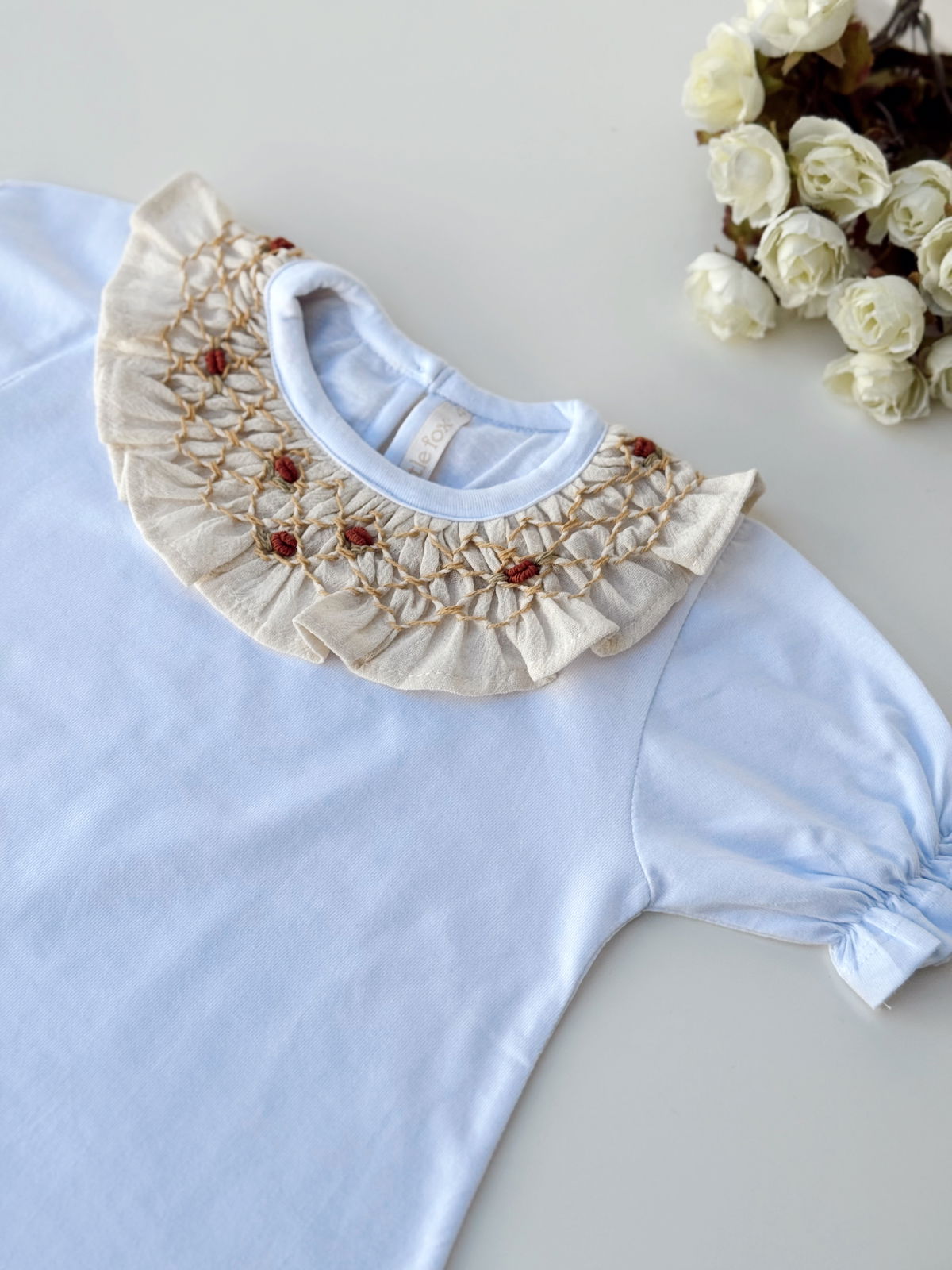 Remera blanca de algodón, con manga corta con frunce y cuello natural punto smock.