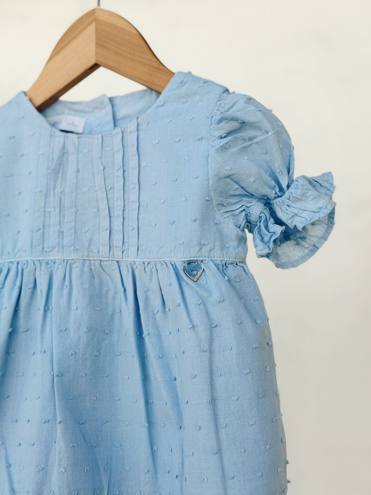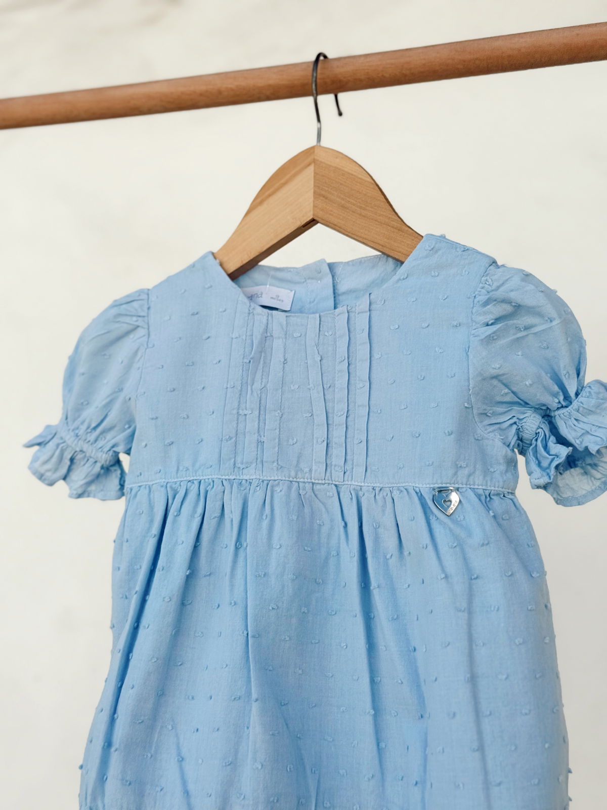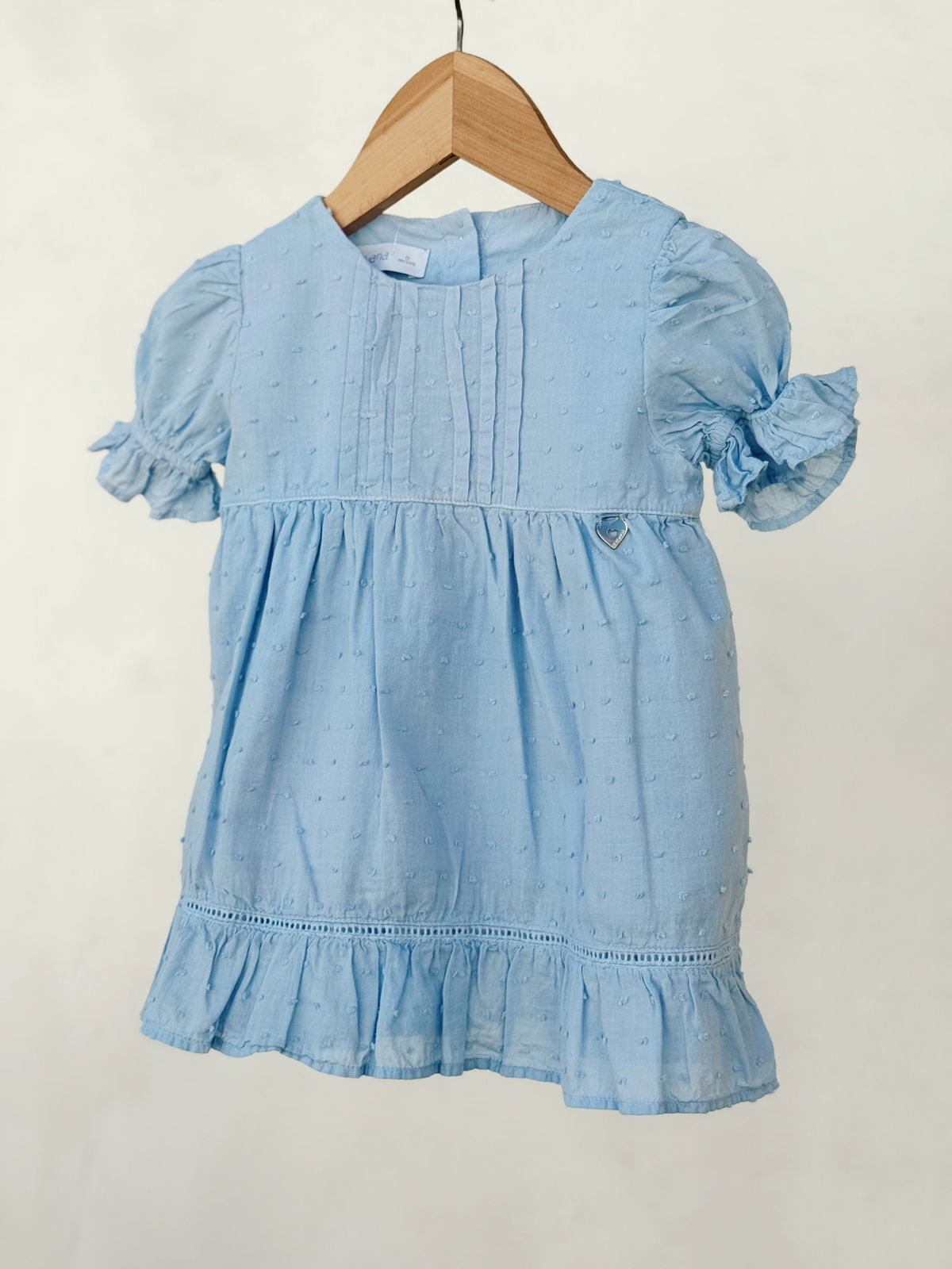 Vestido de plumetí de algodón celeste, manga corta con vuelo.